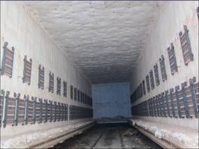 許多單位的熱處理爐采用地坑形式,受限于吊裝、冷卻速度慢等原因,效率比較低。金心公司的熱處理爐是建造在地面上,爐底采用自行走臺車結(jié)構,臺車載重80t,容器熱處理完畢,啟動開門按鈕,臺車沿導軌進入車間,車間內(nèi)的起吊行車迅速將熱處理完成的設備卸下臺車,再裝另外待熱處理的壓力容器,一個新的循環(huán)開始,熱處理效率高。