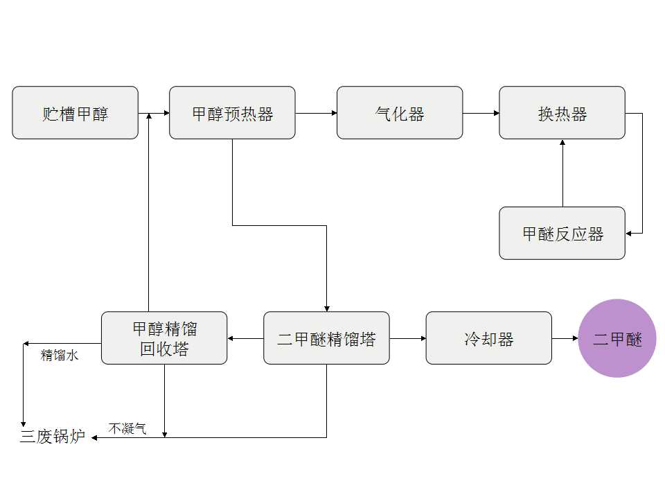 粗甲醇經(jīng)二甲醚精餾塔出 口冷凝器預(yù)熱后,送入甲醇?xì)饣?,用甲醇反?yīng)熱把甲醇汽化,汽化后的甲醇經(jīng)反應(yīng)器出 口換熱器換熱升溫,在220℃左右經(jīng)開車電加熱器送入反應(yīng)器上部,在260---280℃之間,經(jīng)催化反應(yīng)后,出反應(yīng)器,經(jīng)出 口換熱器換熱降溫后,進(jìn)入甲醇回收塔再沸器,替代部分蒸汽加熱二甲醚精餾后殘液,同時繼續(xù)降溫,后經(jīng)甲醇冷卻到1000℃左右送入二甲醚精餾塔,精餾出二甲醚,經(jīng)降溫后送入成品灌區(qū)。