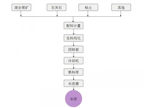 石灰質(zhì)原料、粘土質(zhì)原料與少量校正原料經(jīng)破碎后按一定比例配合、磨細(xì)并調(diào)配為成份合適、量質(zhì)均勻的生料。將生料放在水泥窯內(nèi)煅燒至部分熔融以得到主要成分為硅酸鹽的水泥熟料。 經(jīng)冷卻后放入熟料庫(kù),熟料加入適量石膏、混合材料或添加劑共同磨細(xì)為水泥,并包裝出廠。